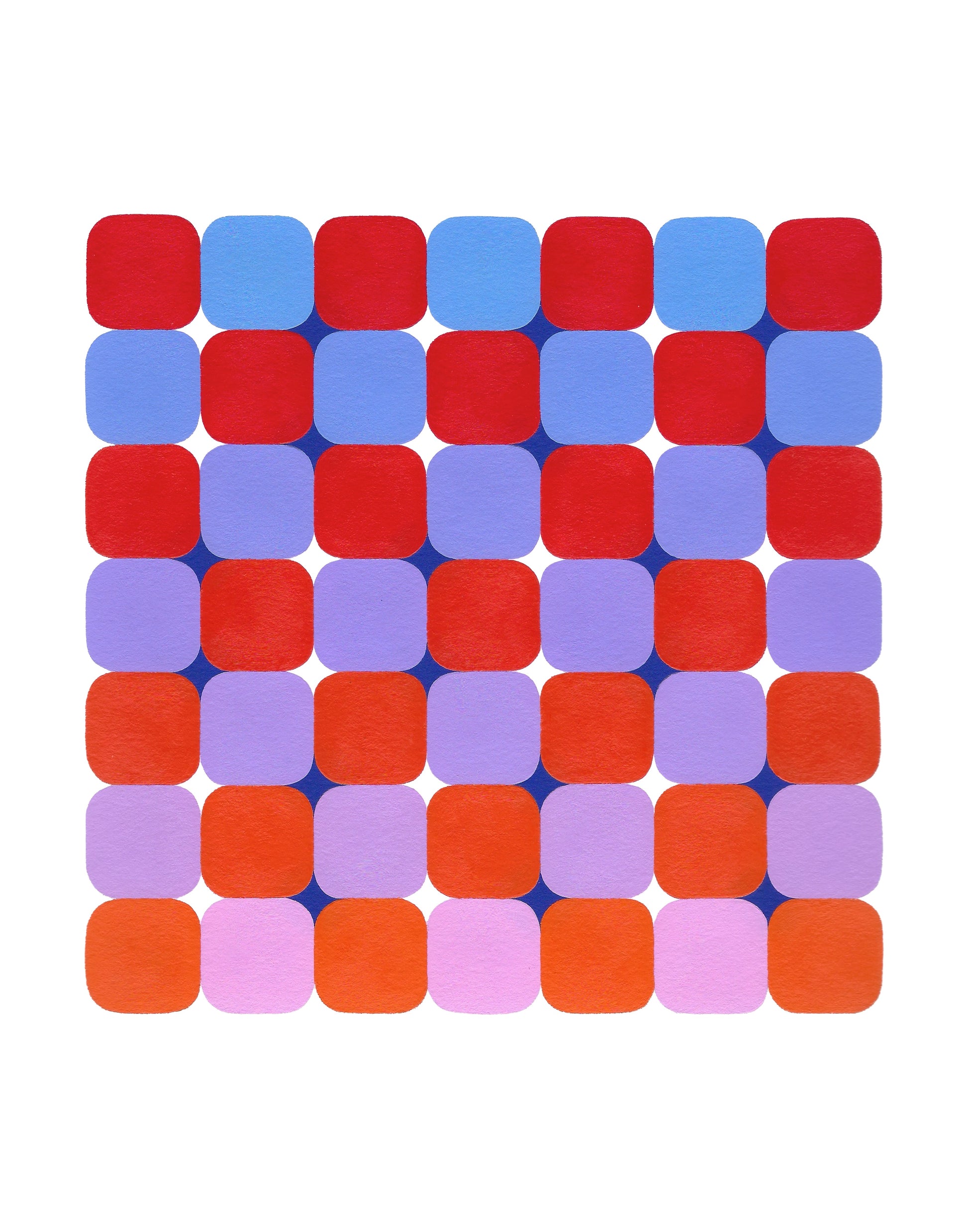 "Spring of 2024 was when I began exploring checkered illusions. There are so any variations, and all are dependent upon the placement of the light and dark gap colors at the corners of the rounded squares. In exploring every variation I could find, I also had to see it in every color I could imagine. This is a set of colors I too rarely pair together, but wow is it stunning! This came to be known as the sunset illusion, because many observed that the colors were reminiscent of a sunset."